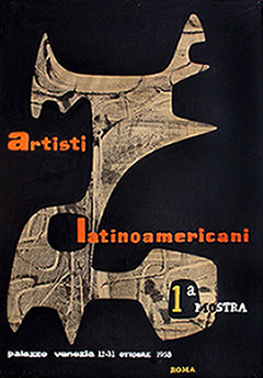 Afiche de la primera muestra de artístas latinoamericános realizada en Venecia, en octubre de 1958. Víctor Pimentel fué invitado a participar.